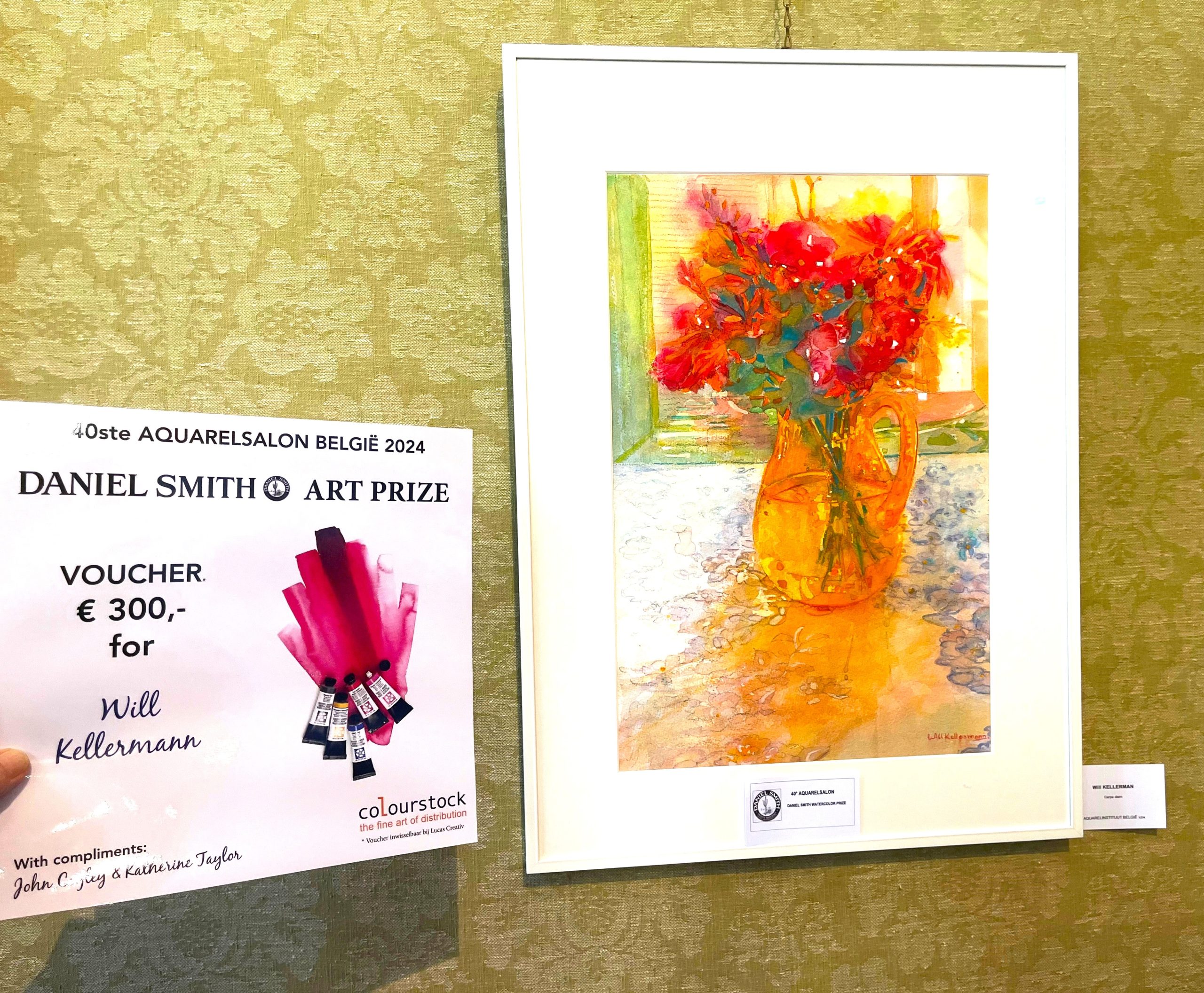 De Daniel Smith Art Prize met complimenten van John Cogley and Katherine Taylor werd uitgereikt voor mijn aquarel “Carpe Diem”. De rijkdom van pigment en kleurkeuze van de aquarel wisten zij zeer te waarderen. De Daniel Smith Watercolours zijn beroemd om hun pigment sterkte en prachtige kleuren. Ik voel me zeer geëerd.