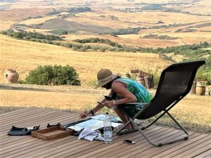 When I paint watercolors, it feels like I’m taking a deep dip in the water. I go to explore the depths of doubt and at the bottom I see my pigments. It’s like I can touch the colors. Then I wave them up from the dark depths, to the light that will make everything clear. My imagination takes a flight. And when I ascend up until behind my painting easel, I let my brush danse on the paper and the watercolour of my signature has been born.